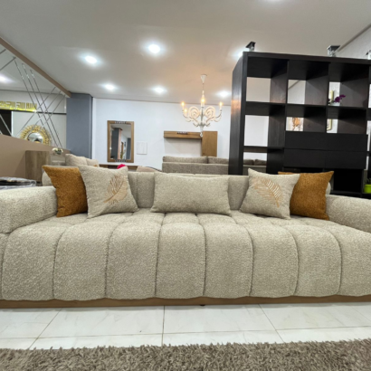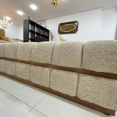 Le Salon Molka combine élégance et durabilité avec son tissu Tricotta antitache et sa carcasse et socle en bois massif, offrant ainsi confort et résistance.